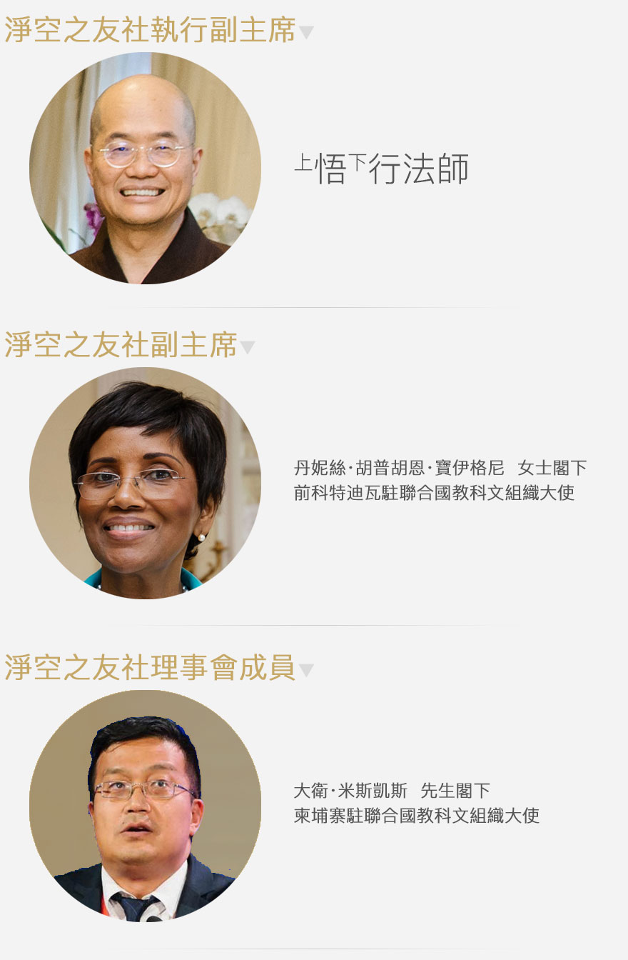教科文組織的大使們為了支持老法師所倡導的「促進宗教團結、恢復宗教教育、弘揚傳統文化」的教育理念,並讓這個理念在教科文組織內弘揚與推廣,進而傳播、落實於世界更多的地方,於二〇一七年七月,提出為老法師成立多元宗教辦公室的提議。經過教科文組織審查核准,定名為「聯合國教科文組織 淨空之友社」(Association of Master Chin Kung’s Friends at UNESCO)。